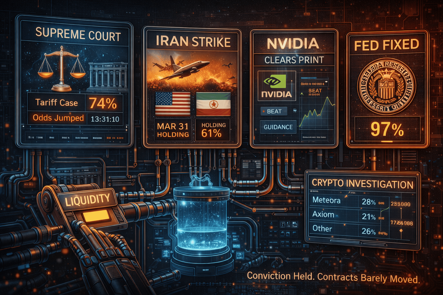 The Supreme Court tariff-hearing odds jumped to 74%. Iran’s March 31 window held at 61%. Warsh remains 94%. Stocks rallied. The core contracts barely moved.
