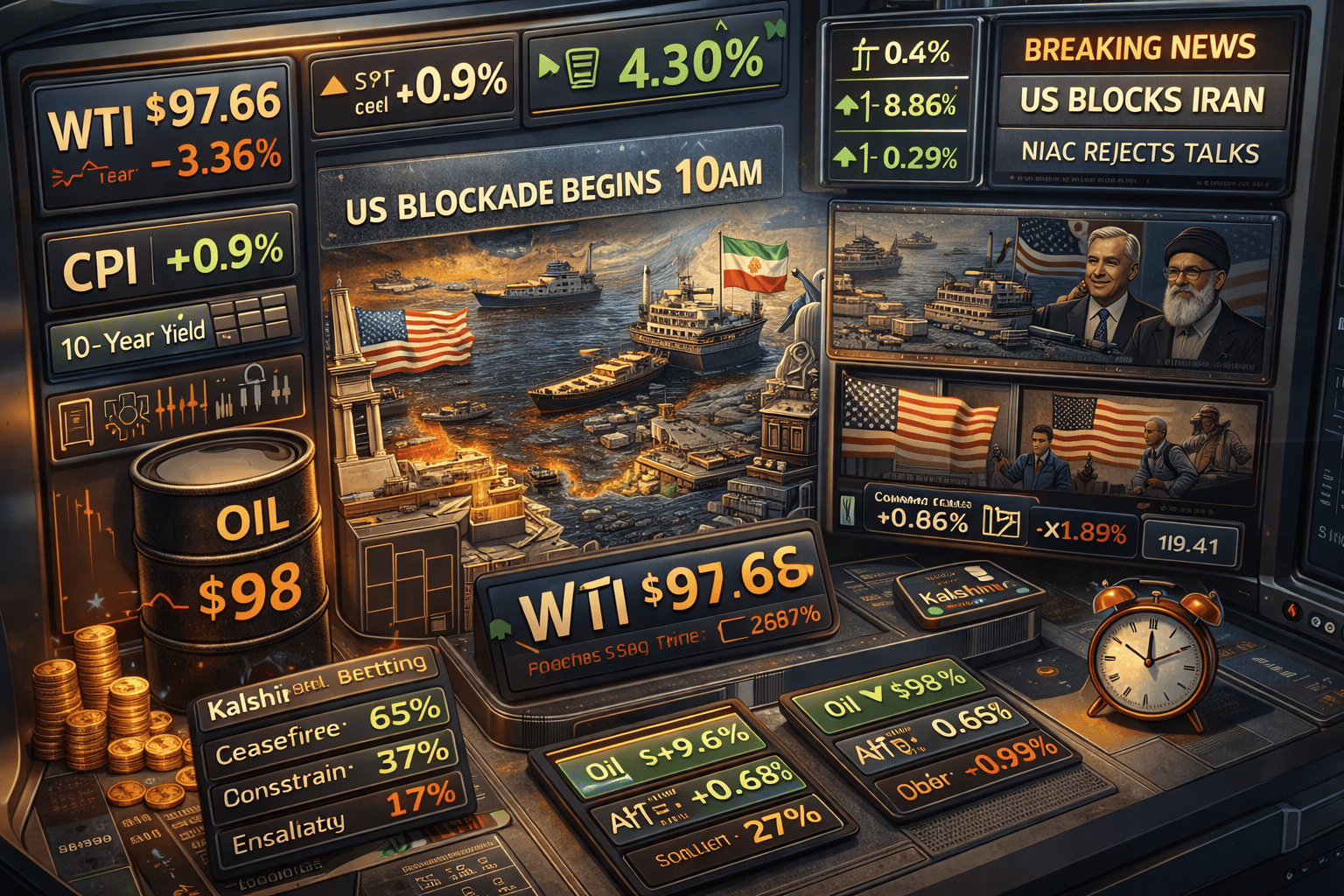 WTI surged above $104 and closed below $98. The US blockade began at 10am. Equities finished higher. The escalation landed. The regime did not change.