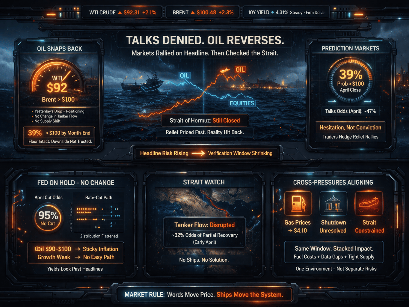 Oil reversed. The Strait stayed closed. Equities stalled. Nothing underneath changed.