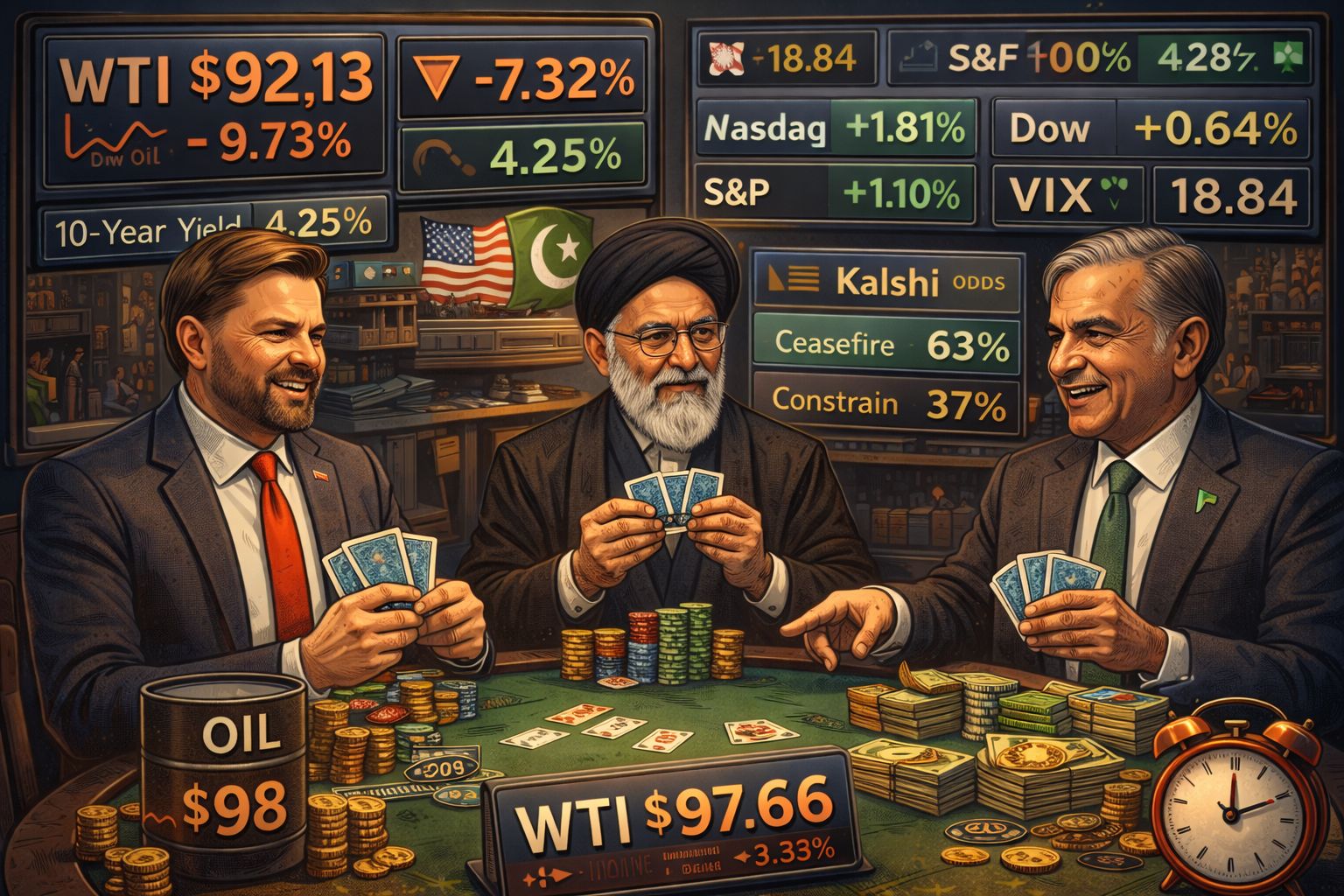 WTI fell below $93. Stocks surged across all three indices. Blockade impact tightened. Talks revived. The calendar moved. The ceiling didn’t.